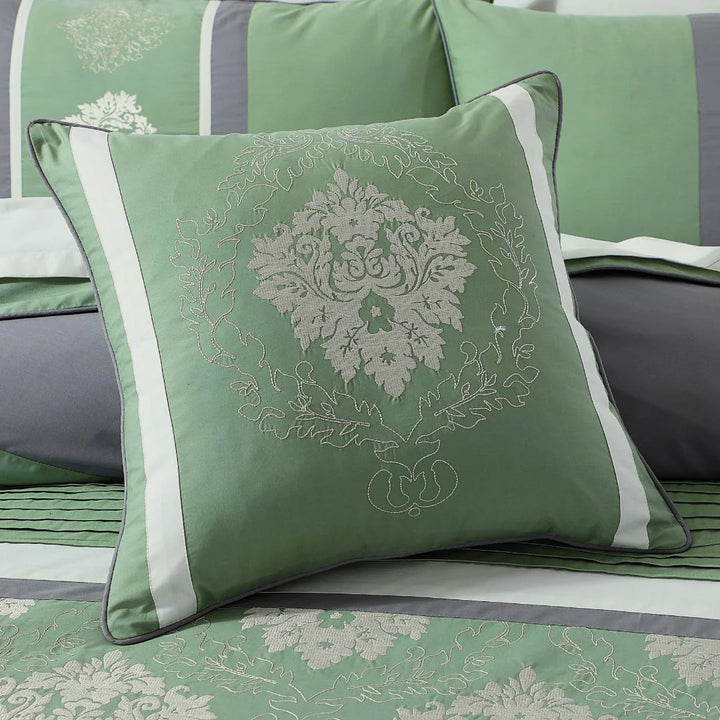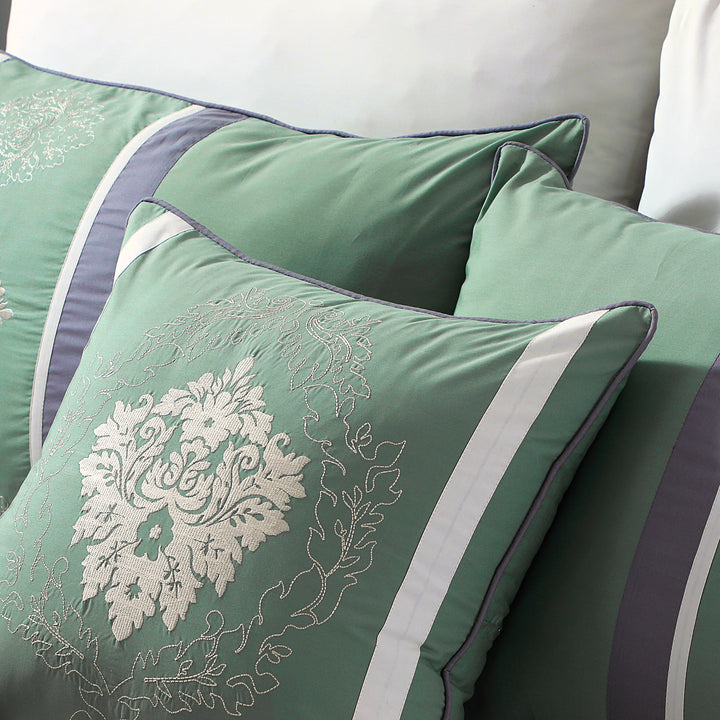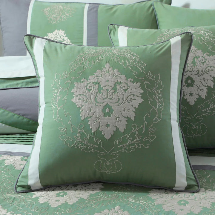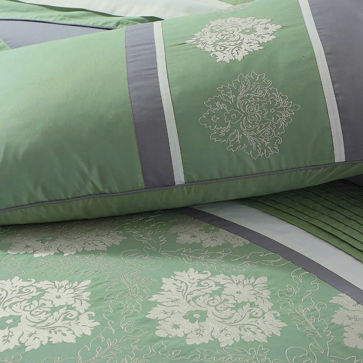 Delve into a calm, serene stupor with soothing pastels featuring classic embroidery on a combination of sea green and grey, paired with a white flat sheet set.
