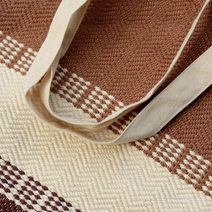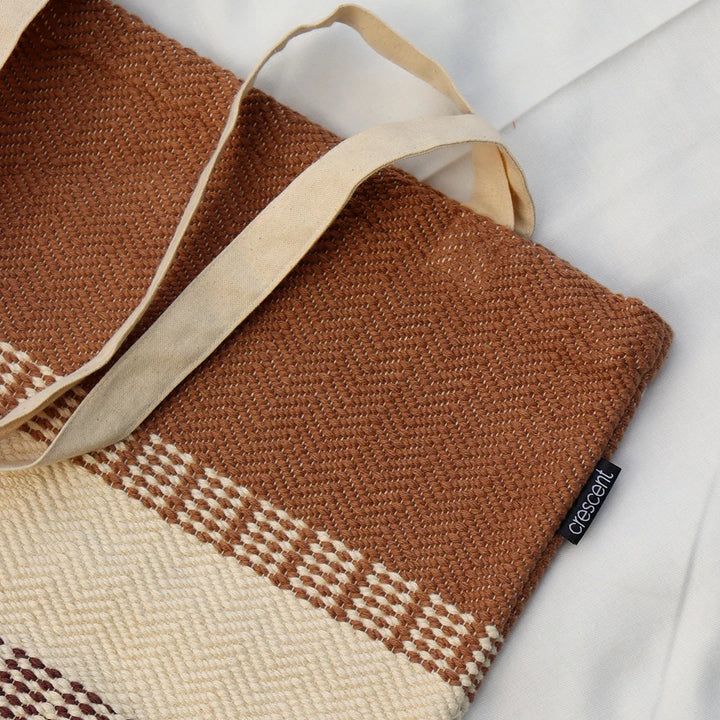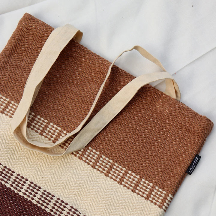 Carry timeless style with this handmade woven tote bag, crafted with care from high-quality cotton. Featuring a warm brown base with elegant beige and cream stripes, this bag beautifully blends earthy tones in a minimalist design.